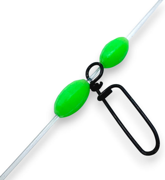 - 225lb Coastlock Snap Swivel with beads on each side acts as a sinker slide along the leader section.