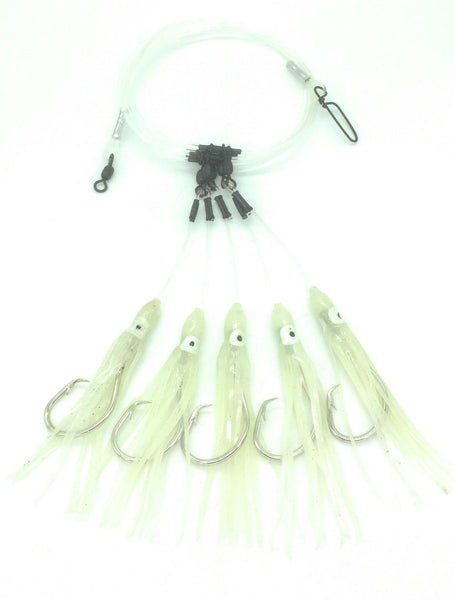 Deep drop rigs with super bright 4.75" glow squid in 5 hook options with the following components: