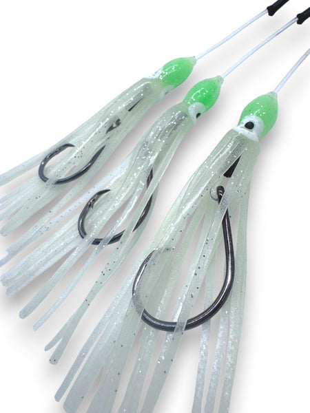 Deep drop rigs with super bright 4.75" glow squid in 3,5 hook options with the following components: